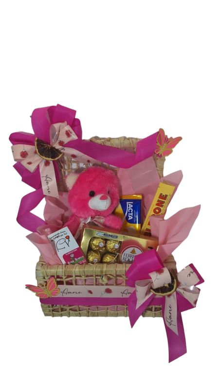 Cesta baú decorada nº 02: Urso para 1 caixa de Ferrero com 8 bombons, 1 barra de chocolate e 1 Toblerone.