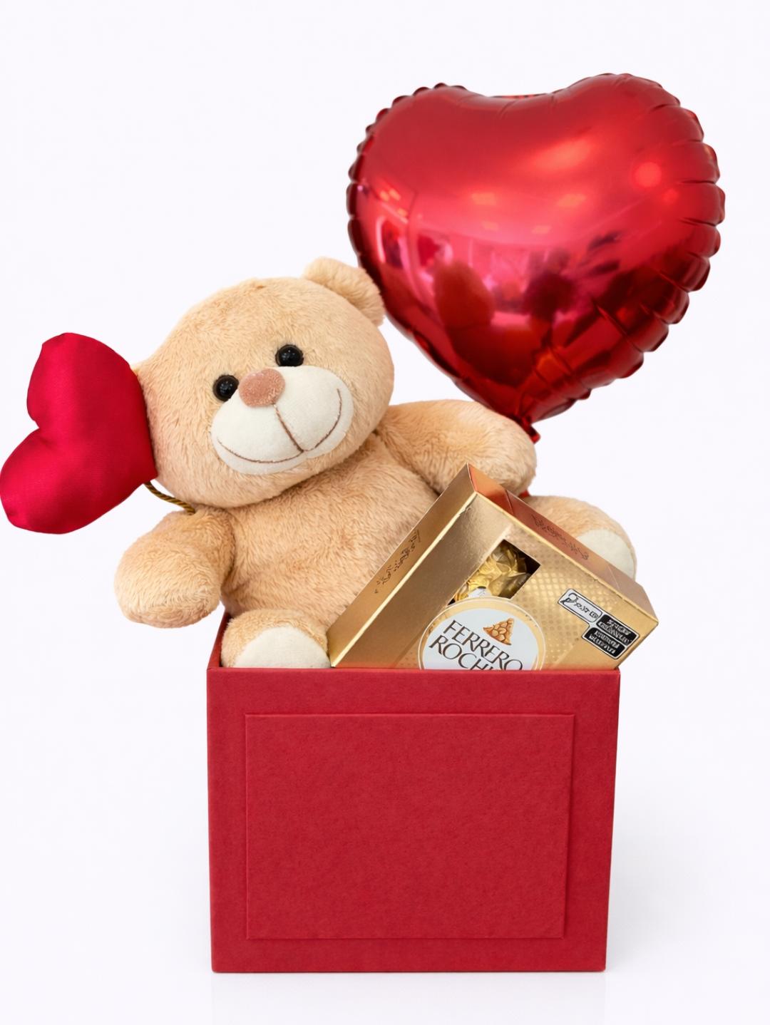 Este lindo box é composto por um ursinho de pelúcia super fofo, acompanhado de uma caixa de chocolates Ferrero Rocher e um balão em formato de coração, criando uma combinação perfeita de amor e delicadeza.