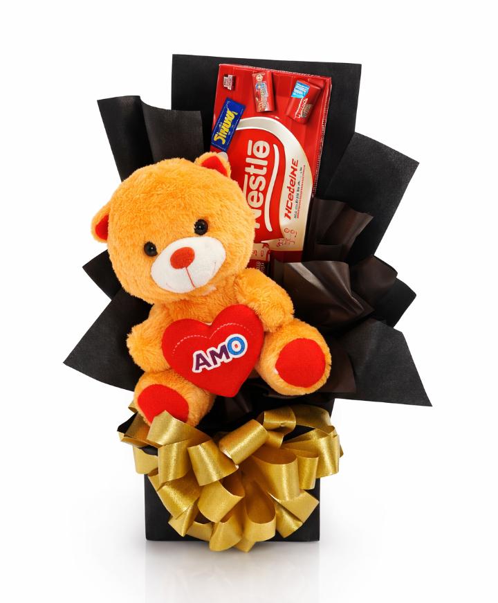 Um lindo ursinho de pelúcia segurando um coração ❤️ acompanhado de deliciosos chocolates, tudo cuidadosamente montado em uma elegante embalagem em preto com laço dourado.