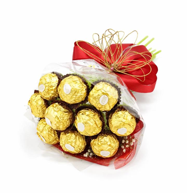 Este lindo buquê é composto por deliciosos chocolates Ferrero Rocher, cuidadosamente montados em uma charmosa embalagem transparente, finalizada com um sofisticado laço vermelho e detalhes dourados.contendo 10 bombons deliciosos.