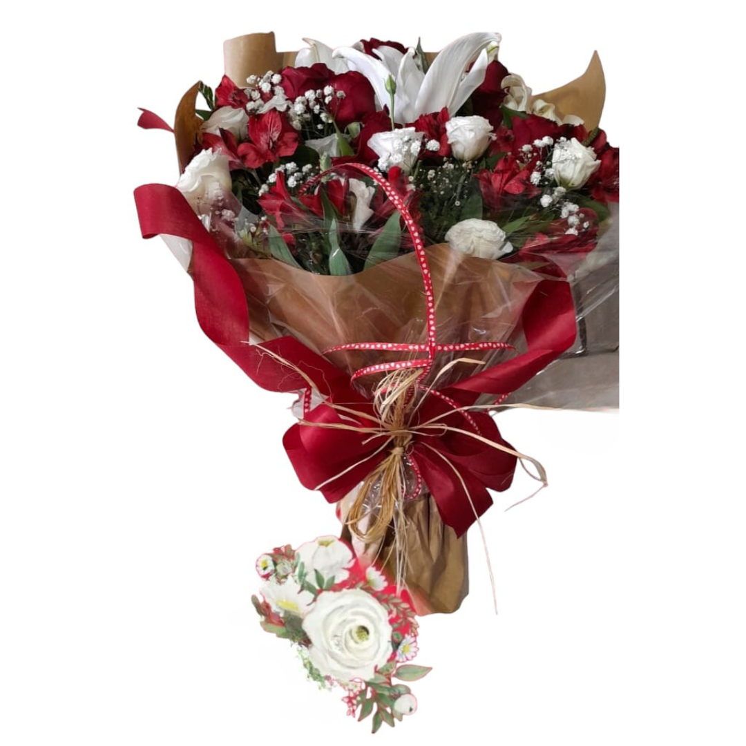 12 rosas vermelhas nacionais 1 haste de lirio branco , 3 hastes de lisiantus branco .