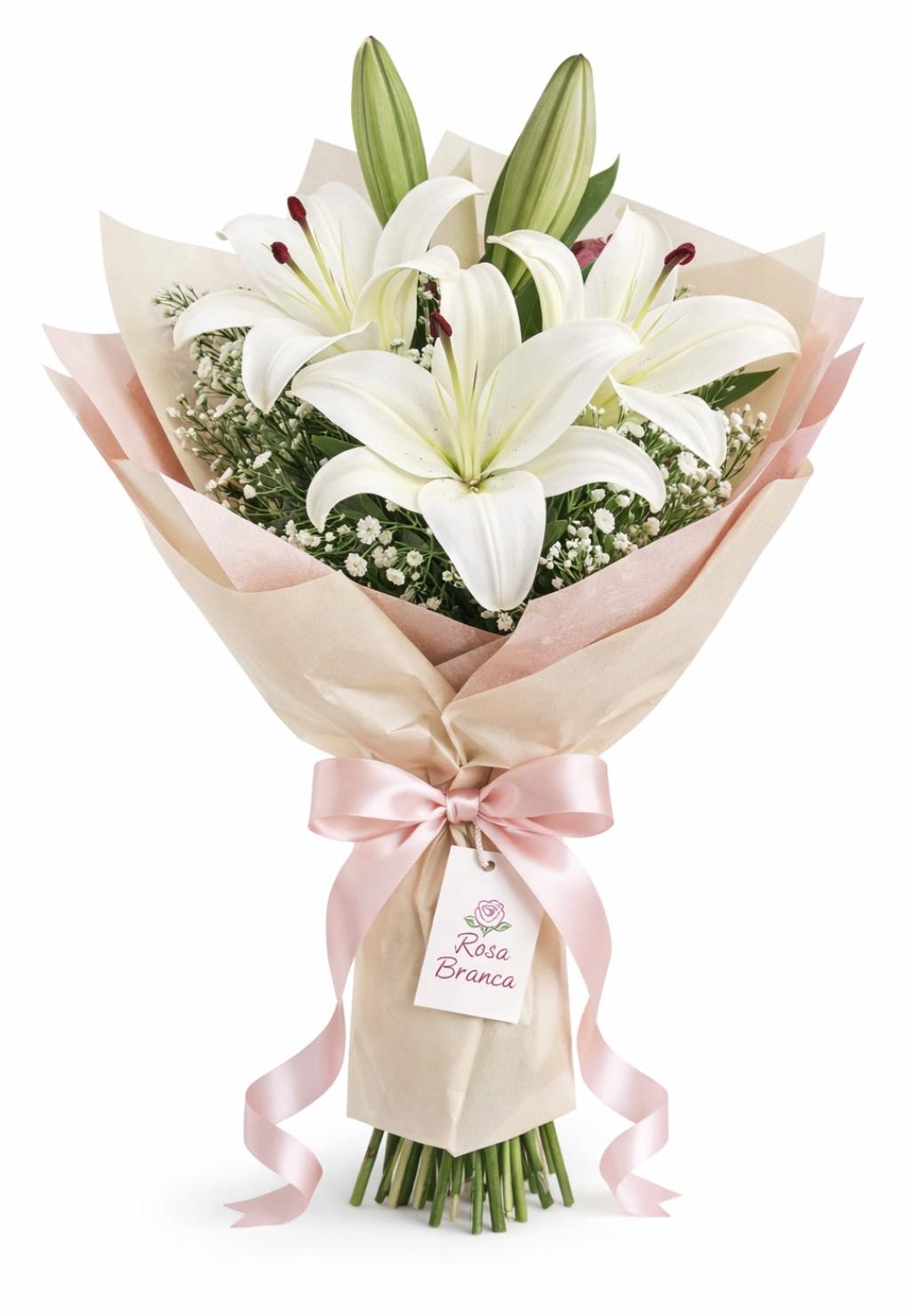 Encante com a elegância dos lírios brancos, um buquê delicado e sofisticado que transmite paz, carinho e admiração. 💐✨