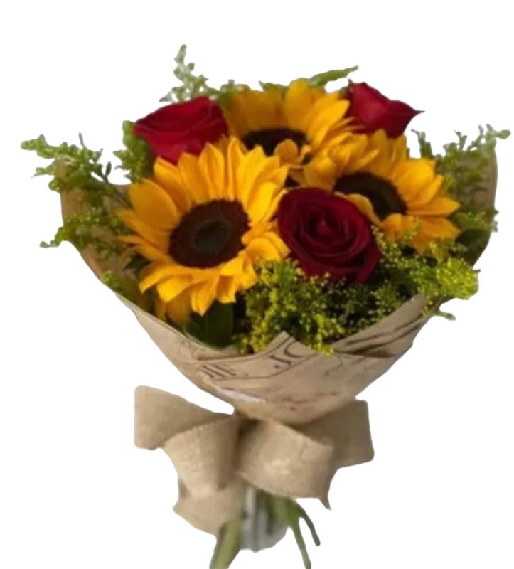 Buquê com 3 girassóis e 3 rosas vermelhas.