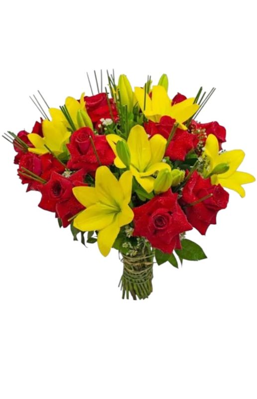 Buquê Elegância Exuberante: Rosas nacionais e lírios amarelos - Um presente sofisticado e inesquecível!